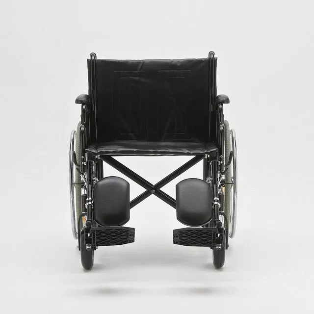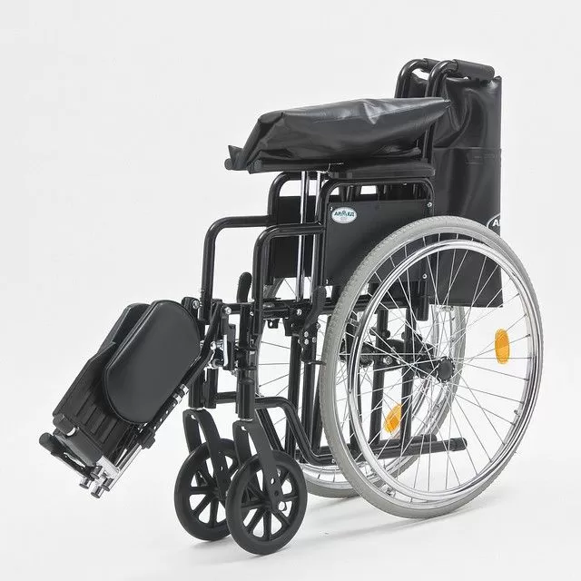 Кресло-коляска из искусственной кожи с усиленной рамой предназначено для людей с двигательными нарушениями. Помимо прочности, материал обшивки отличается удобством ухода и дезинфекции. Подножки оснащены мягкими опорами под голени: пользователю будет комфортно в течение всего дня. Рама коляски складная, что упрощает ее хранение и перевозку в автомобиле. Для безопасности на уклонах и дополнительного удобства передвижения имеются антиопрокидыватели с колесами.