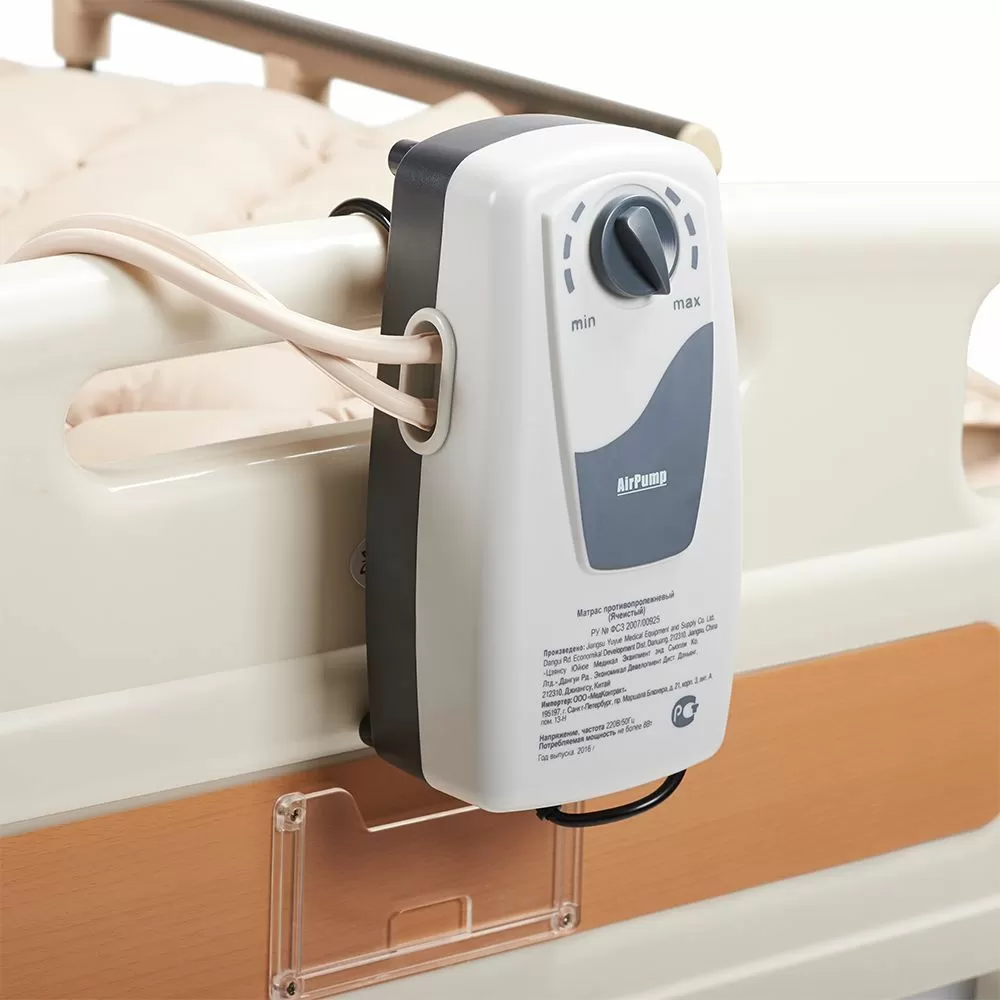 - Компрессор оборудован крючками, которые накидываются, например, на боковину кровати для закрепления. Регулировать давление может сам пользователь или обслуживающий человек.