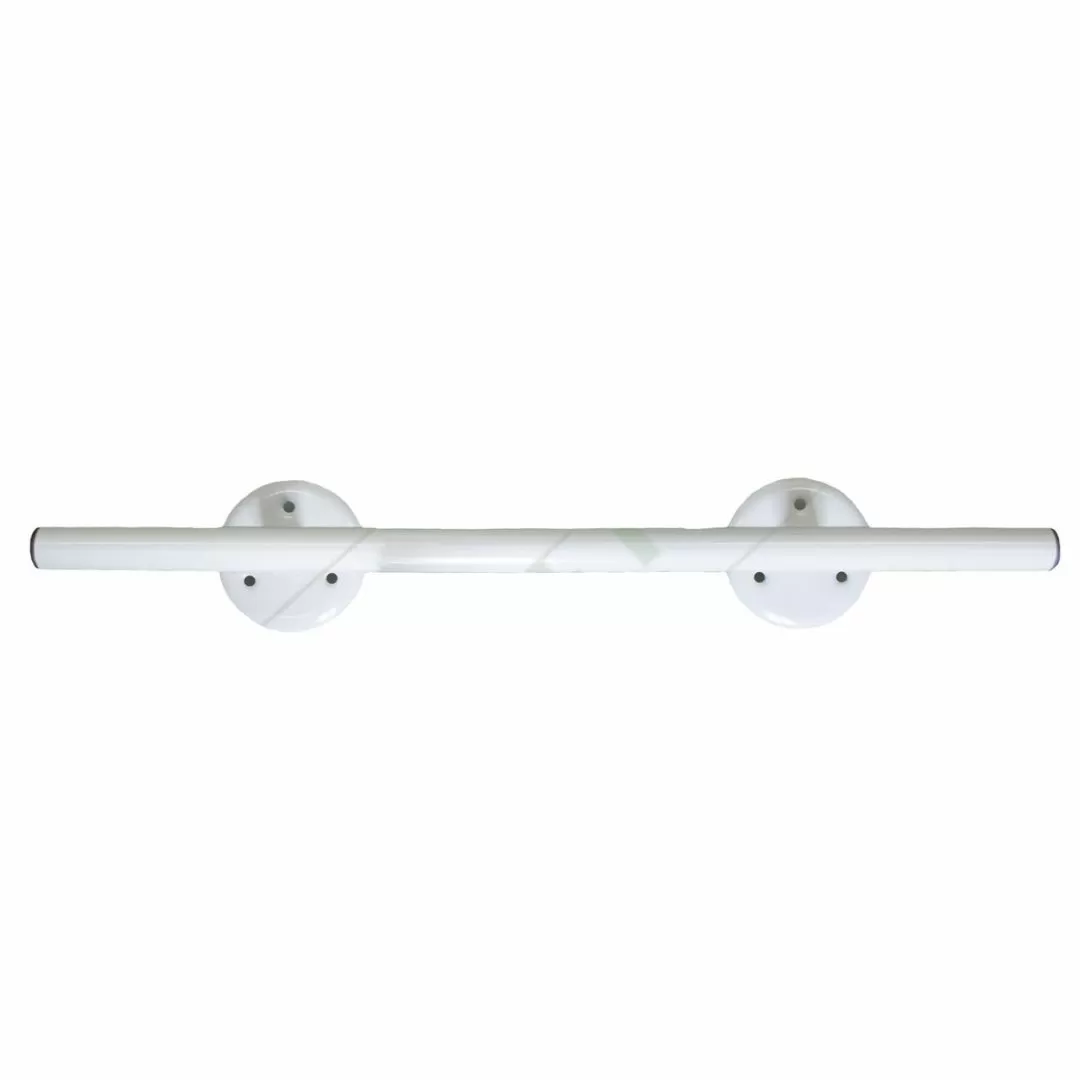 Поручни служат для удобства передвижения по дому, а так же в туалете и ванной. Диаметр фланцев 85 мм, с тремя крепежными отверстиями под шурупы диаметром 4 мм в каждом из них. Размер от края трубы до центра крепёжного элемента 100 мм.