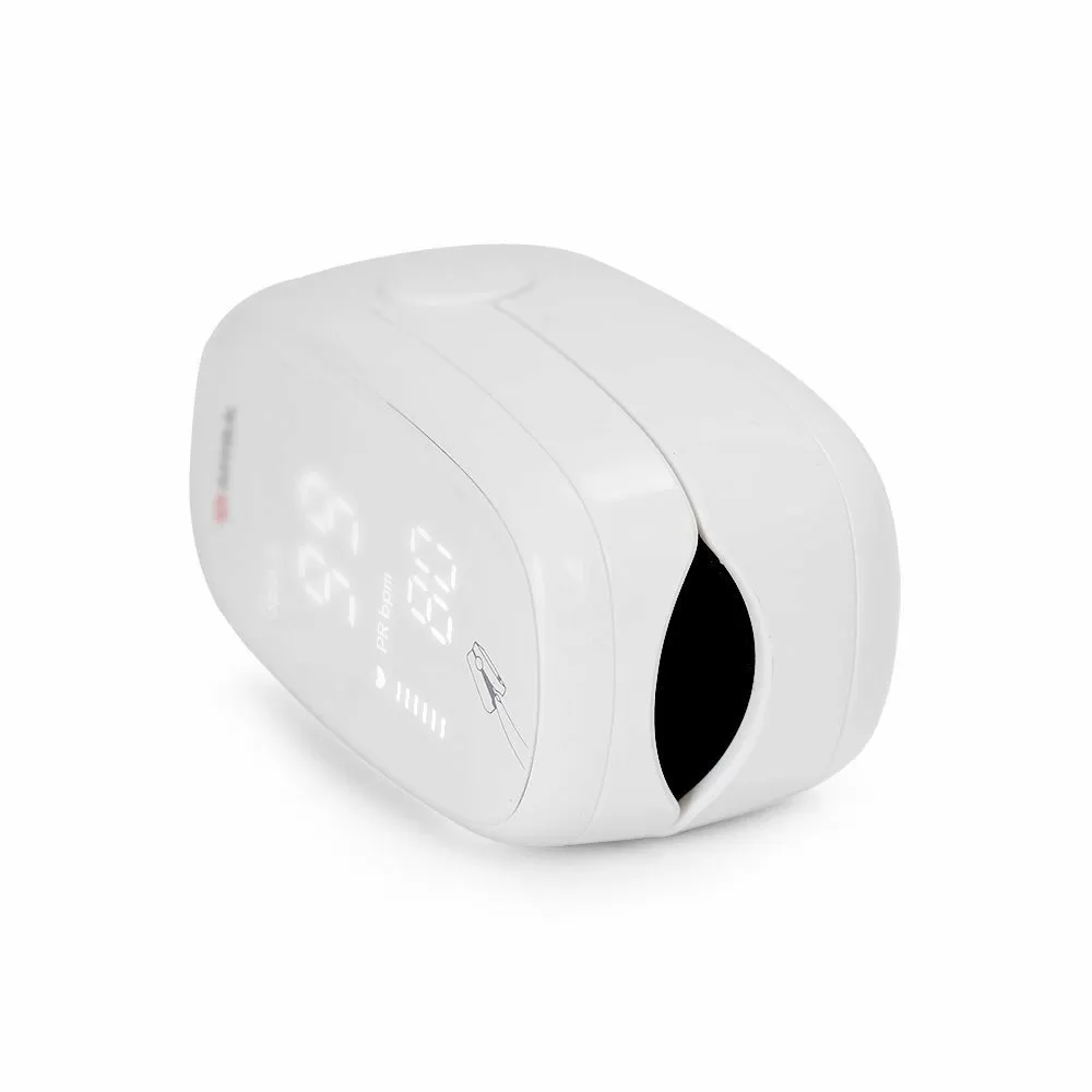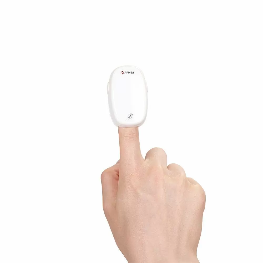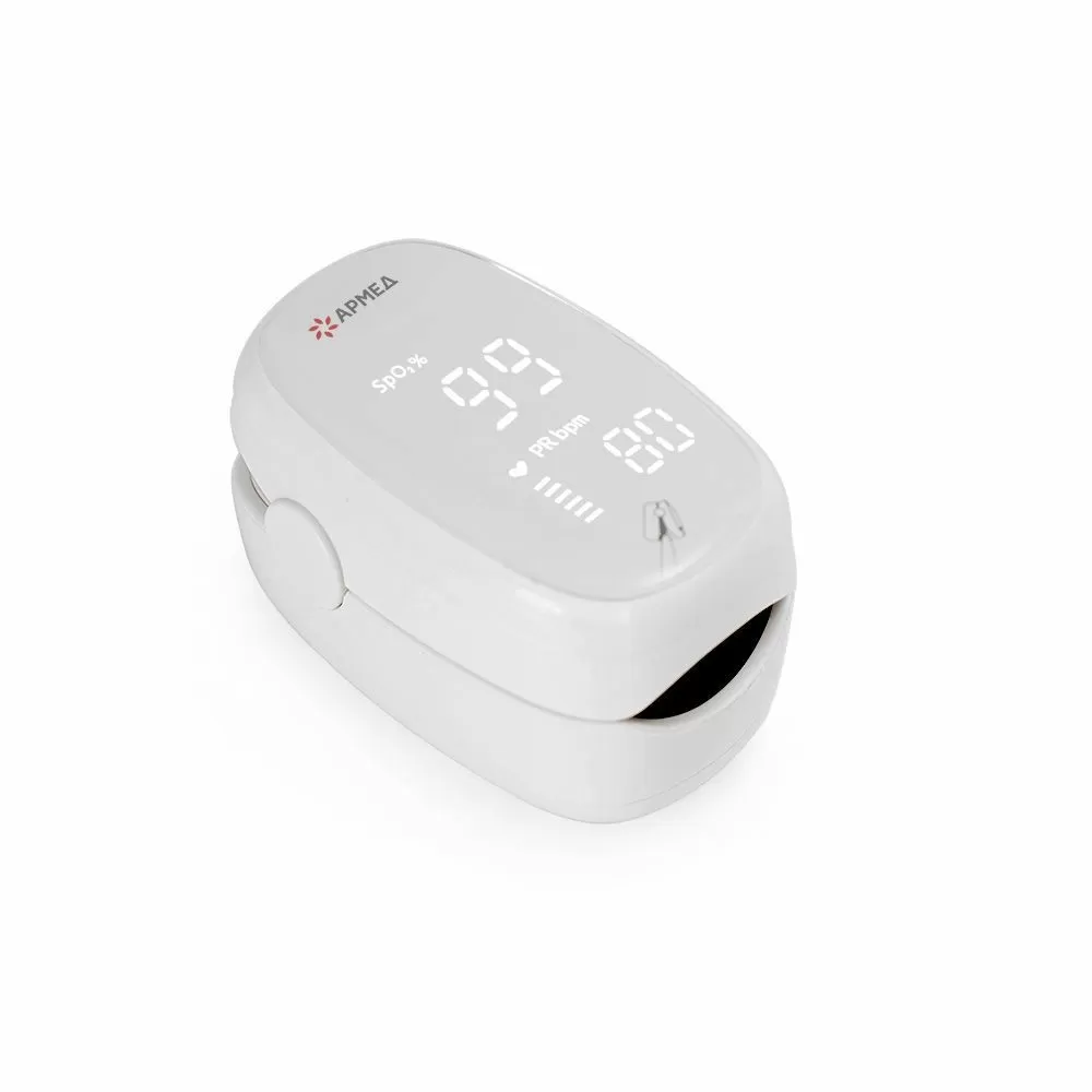 - Пульсоксиметр отличается минималистичным дизайном корпуса и ярким дисплеем, на котором отображаются показатели сатурации, пульса и частота сердечных сокращений.