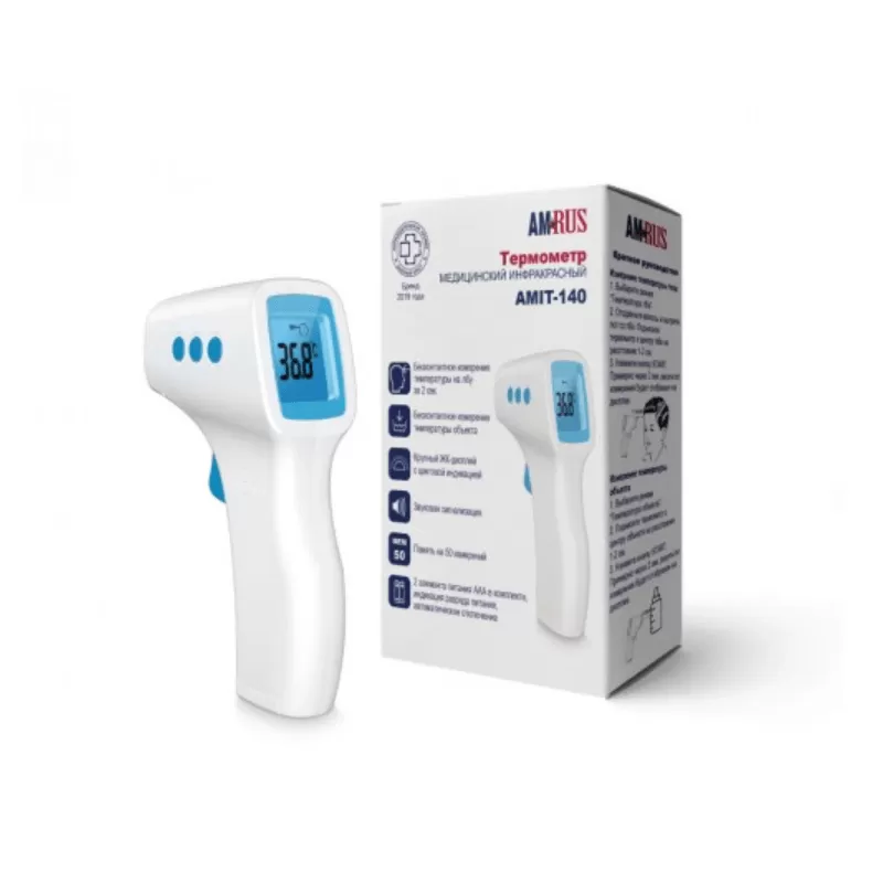Инфракрасный медицинский термометр AMRUS AMIT-140 предназначен для измерения температуры тела человека (на лбу) и температуры объекта бесконтактным способом. Время измерения – 1-2 сек. Прибор имеет крупный ЖК дисплей с цветовой индикацией, звуковую сигнализацию и память на 50 измерений. В комплект входят 2 элемента питания ААА. Термометр имеет индикацию разряда питания и автоматическое отключение.Прибор меняет цветовую индикацию в зависимости от температуры: